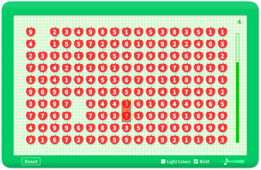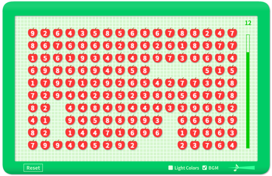 이렇게 수 많은 숫자판에서 숫자 합이 10이 되는 숫자를 묶어서 터트리는 게임입니다.