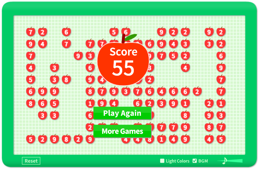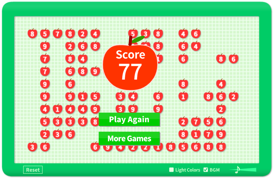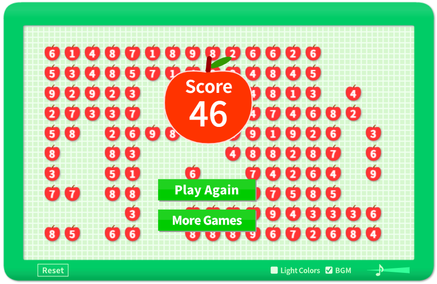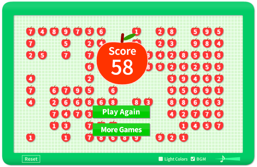 사과게임은 그림과 마우스를 드래그하여 사과를 정확히 둘러싸서 사과 안의 숫자 합이 10이 되도록 합니다.